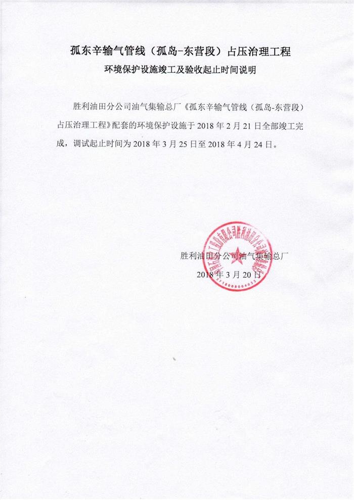孤東辛輸氣管線(孤島-東營段)占壓治理工程環境保護設施竣工及驗收起止時間說明