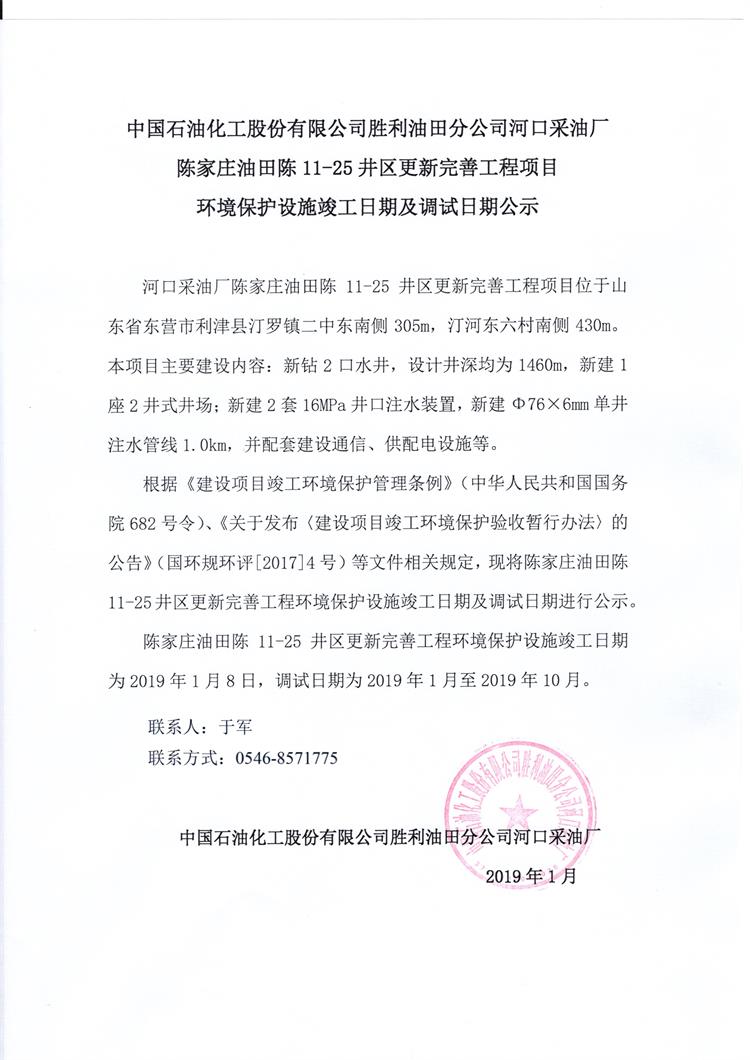 中國石油化工股份有限公司勝利油田分公司河口采油廠陳家莊油田陳11-25井區(qū)更新完善工程項目 環(huán)境保護設(shè)施竣工日期及調(diào)試日期公示