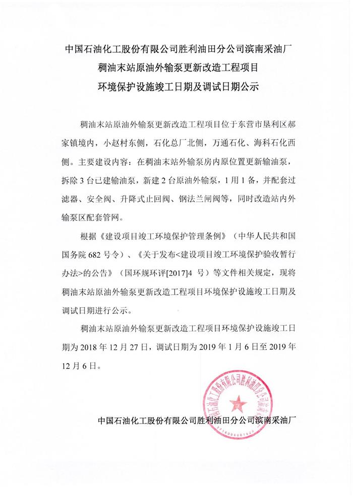 中國(guó)石油化工股份有限公司勝利油田分公司濱南采油廠(chǎng)稠油末站原油外輸泵更新改造工程項(xiàng)目環(huán)境保護(hù)設(shè)施竣工日期及調(diào)試日期公示